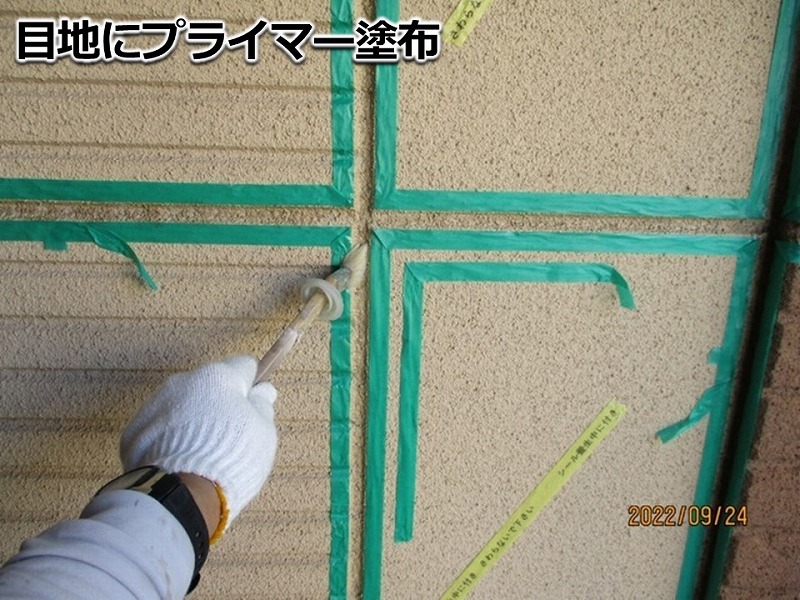目地とシーリング材の密着性が良くなるように、専用のプライマーを塗布して乾燥させます。