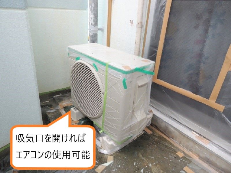 エアコンの室外機をビニールで全て養生してしまうとエアコンは使用できません。ですが室外機の吸気口を開けて、養生を行うという方法があります。通気さえ確保できていれば、外壁塗装中でも問題なくエアコンを使用することができます。