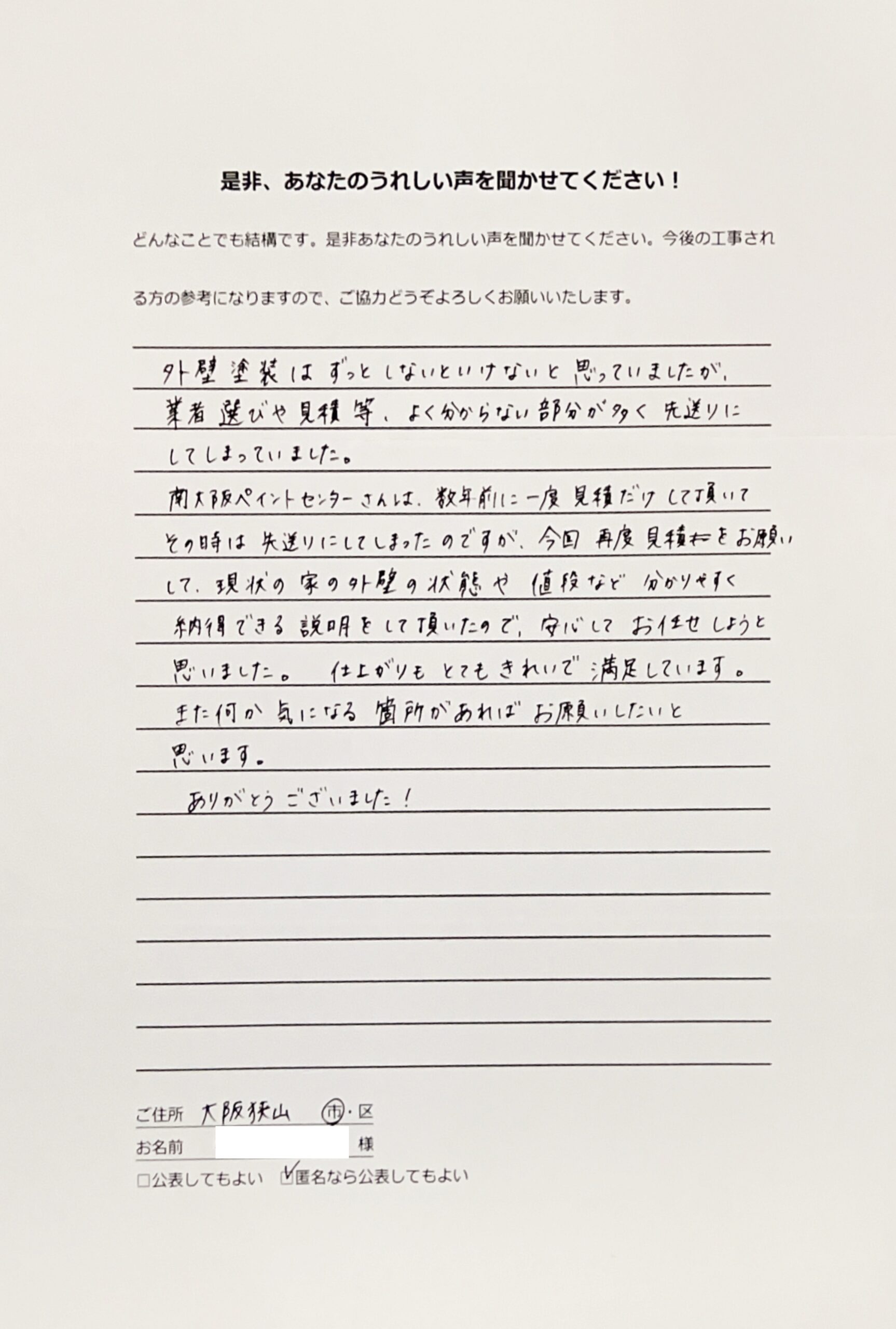 南大阪ペイントセンターさんは数年前に一度見積もりだけしていただいてその時は先送りにしてしまったのですが、今回再度見積もりをお願いして現状の家の外壁の状態や値段など分かりやすく納得できる説明をしていただいたので、安心してお任せしようと思いました。
