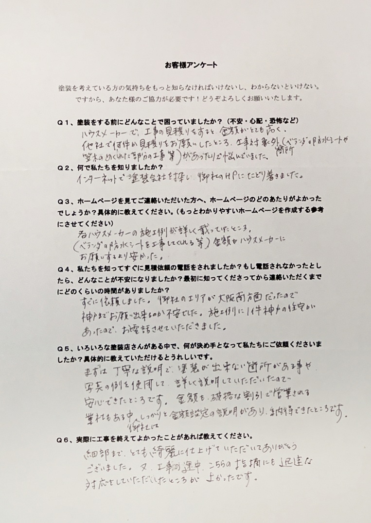 ハウスメーカーで工事の見積もりをすると金額がとても高く他社では何件か見積もりをお願いしたところ、工事対象外箇所(ベランダの防水シートが笠木のめくれた部分の工事等)があったりで悩んでいました。