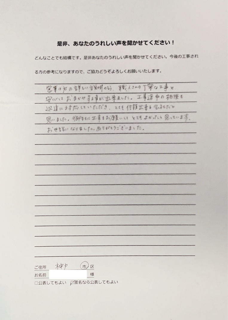 工事途中の相談も迅速に対応していただき、とても信頼できる会社だと思いました。御社に工事をお願いしてとてもよかったと思っています。お世話になりました。ありがとうございました。