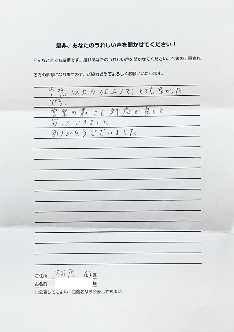 予想以上の仕上がりでとても良かったです。営業の森さんの対応が良くて安心できました。ありがとうございました。