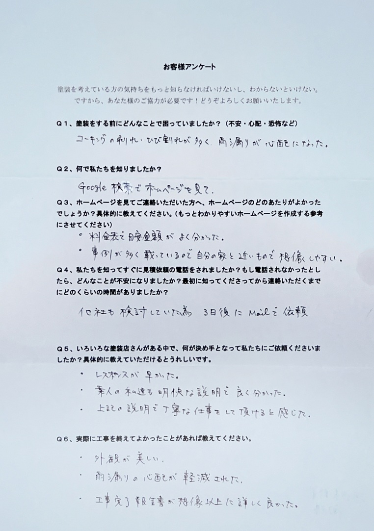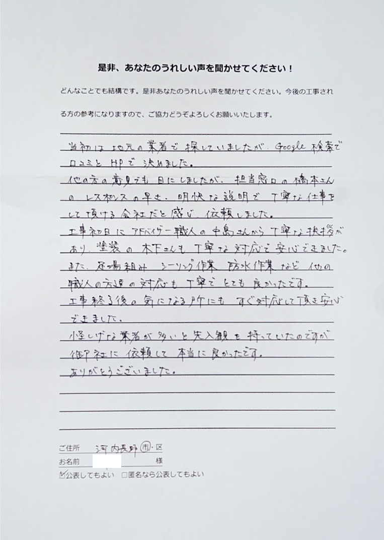 工事終了後の気になる所にもすぐに対応していただき安心できました。怪しげな業者が多いと先入観を持っていたのですが御社に依頼して本当に良かったです。ありがとうございました。
