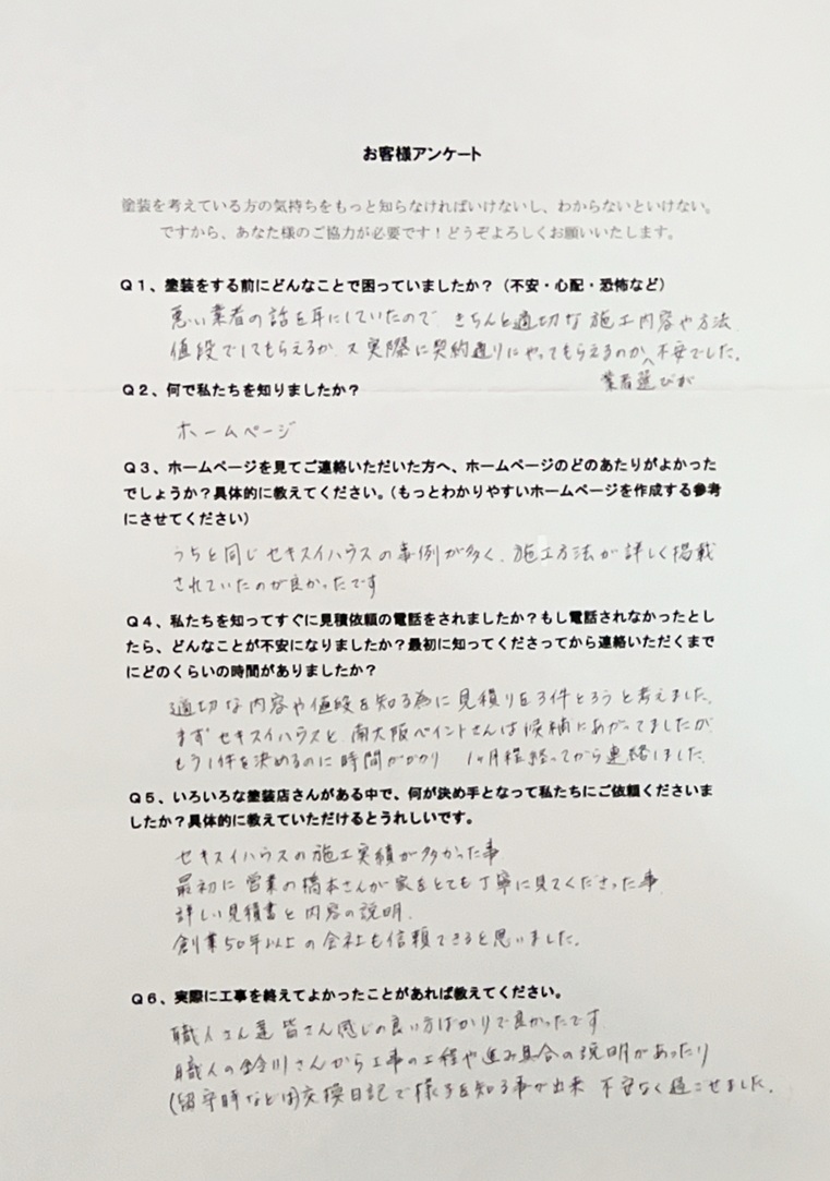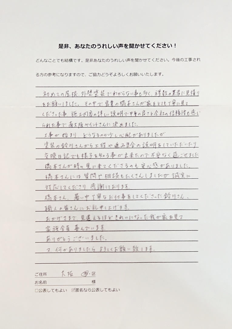 初めての屋根、外壁塗装でわからないことも多く、複数の業者に見積もりをお願いしました。その中で営業の橋本さんが家をとても丁寧に見てくださったこと、施工内容の詳しい説明で中身の良さと会社の信頼性も感じられたことで南大阪ペイントセンターさんに決めました。
