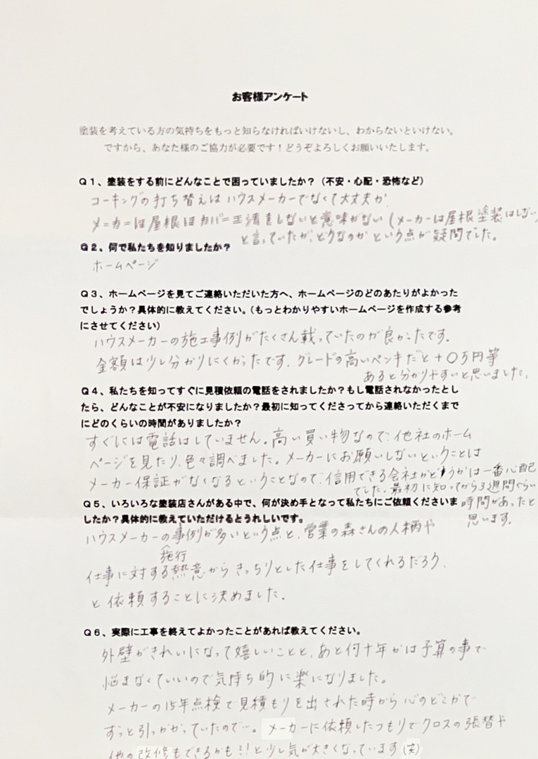 ハウスメーカーの施工事例が多いという点と営業の森さんの人柄や仕事に対する熱意からきっちりとした仕事をしてくれるだろうと依頼することに決めました。