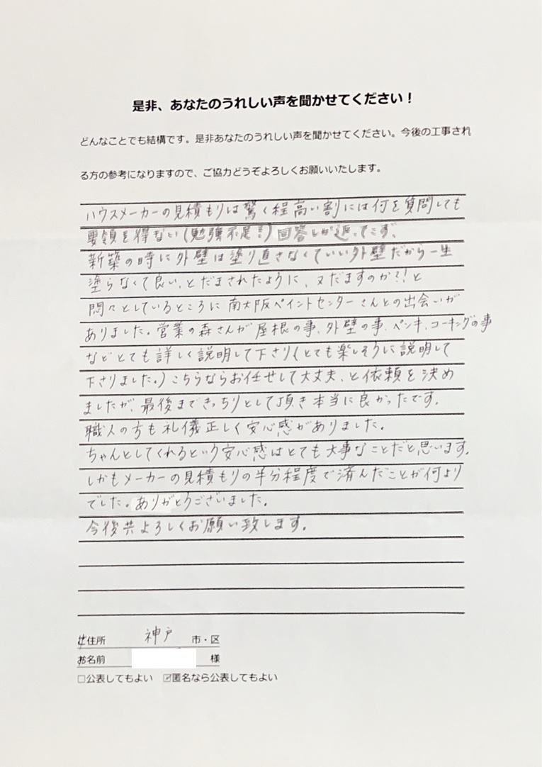 神戸市のハウスメーカーのお客様から嬉しいお声をいただきました