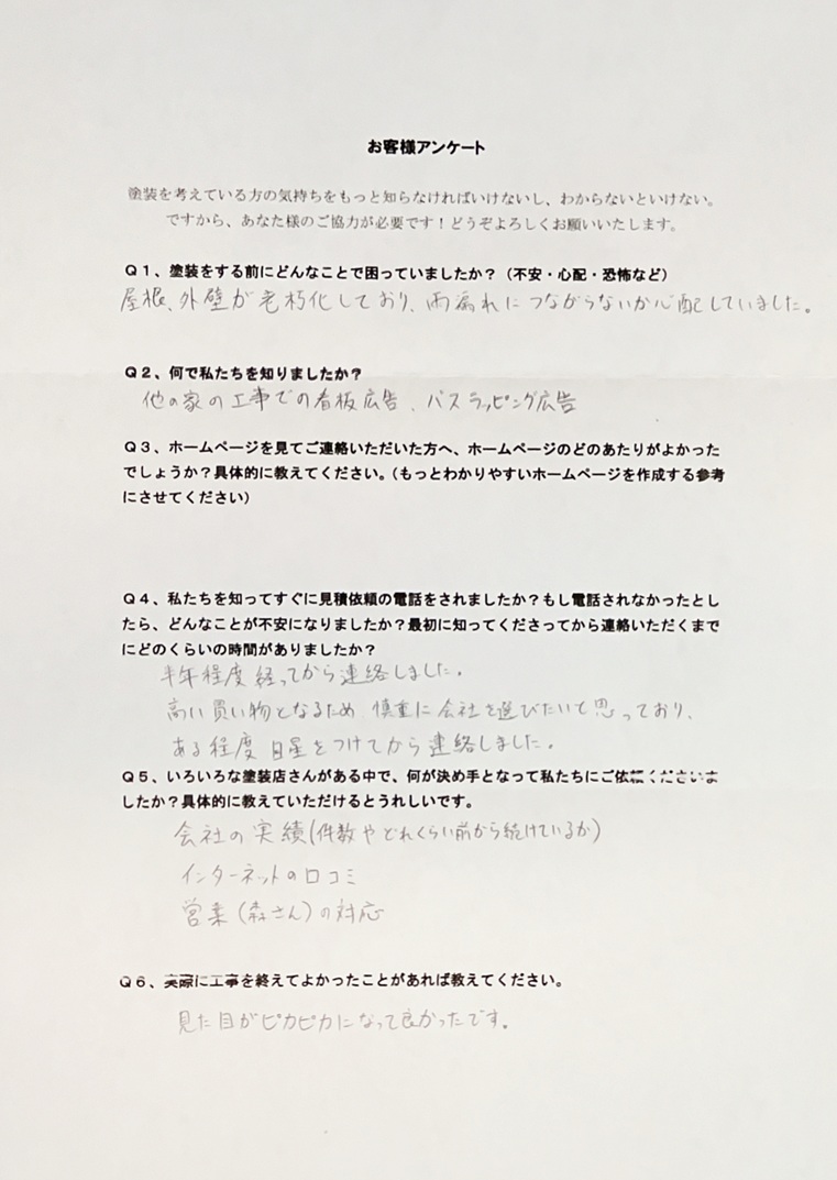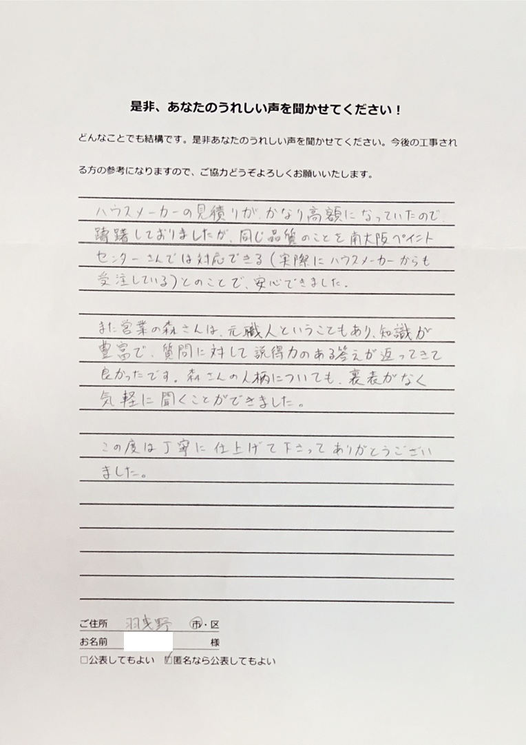 ハウスメーカーの見積もりがかなり高額になっていたので躊躇しておりましたが同じ品質のことを南大阪ペイントセンターさんでは対応できる(実際にハウスメーカーからも受注している)とのことで安心できました。