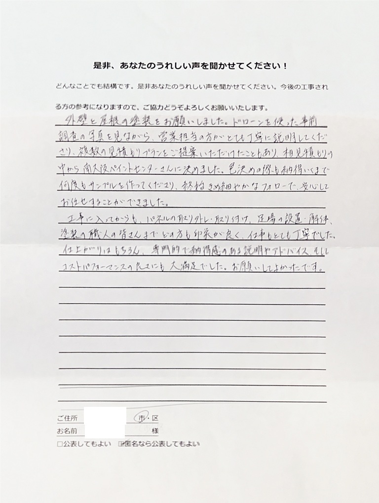 仕上がりに大変満足しております。今後も何かあったら南大阪ペイントセンターさんに頼ることができると心強く思っています。