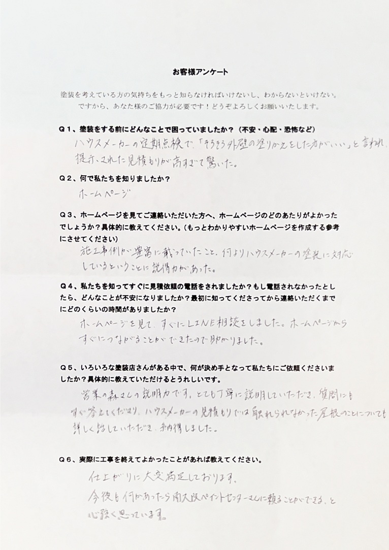 施工事例が豊富に載っていたこと。何よりハウスメーカーの塗装に対応しているということに説得力があった。