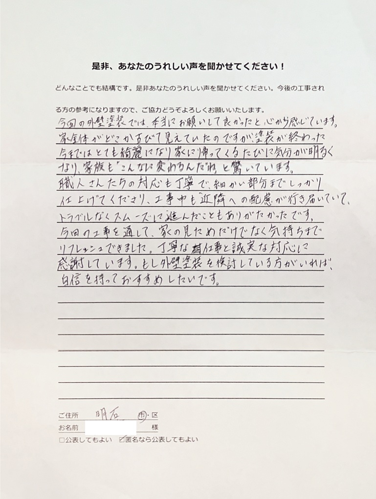 今回の外壁塗装では、本当にお願いして良かったと心から感じています。