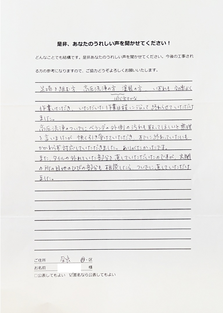 足場を組む方、高圧洗浄の方、塗装の方(※同じ方々かな)いずれも効率よく作業していただき、いただいた作業日程に沿って終わらせていただけました。