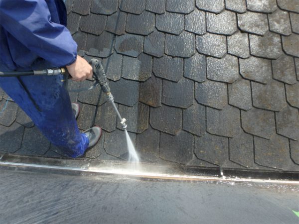 屋根洗浄です。屋根の洗浄しているところと、洗浄していないところがよくわかると思います。屋根を洗い終わったあとは、雨樋の中も洗い流します。排水口付近が詰まっていることが多いです。落ち葉や泥が多いですよ。