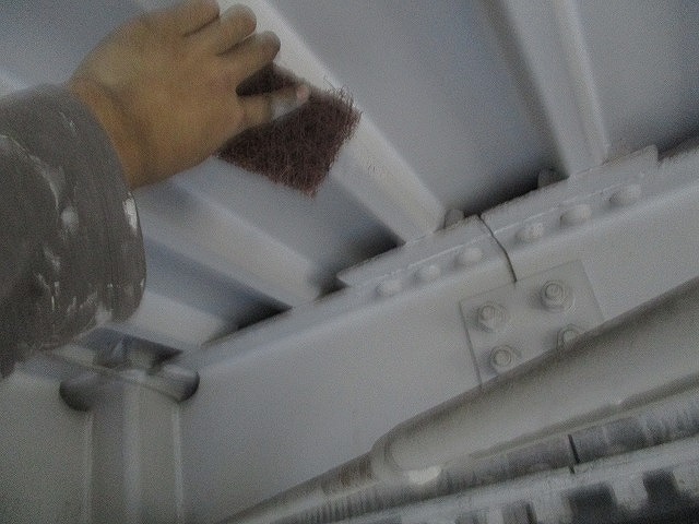 まずは研磨材で、サビやホコリを落としていきます。この丁寧な下地処理が、塗装の寿命を長くします。