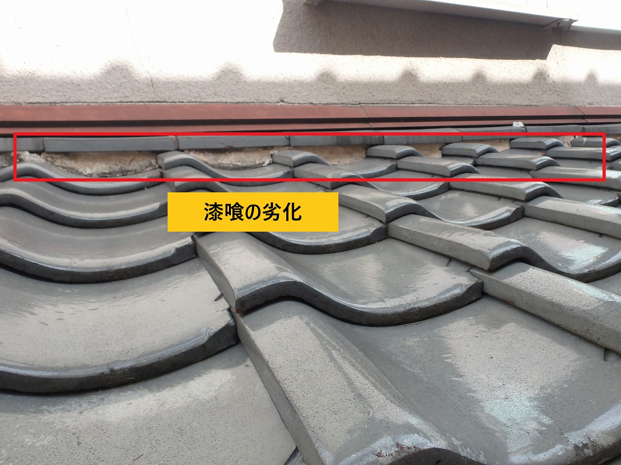家の下から屋根を見上げても漆喰の劣化状態はなかなか分かりにくく、雨漏りして初めて気づく場合も多くあります。では、漆喰が劣化するとなぜ雨漏りに繋がるのでしょう?先程記述した様に、漆喰は雨水の侵入を防ぐ役割を担っています。丈夫に作られている漆喰ですが、建物の揺れや紫外線などの劣化で割れや剝がれが見られるようになります。瓦の下葺き材には「葺き土」といわれる土が敷かれてますが、漆喰が剝がれる事で葺き土がむき出しになり雨水を吸い込んでしまいます。葺き土は当然雨水を含むと緩くなり次第に流れ出していきます。瓦を固定している下葺き材が流れる事により棟の形が崩れ、徐々に建物内部に水が回ってしまうのです。漆喰の劣化が軽度で室内への雨漏り等を起こしていない様な時は、劣化が目立つ部分などを取り除き再度漆喰を詰め直す工事でメンテナスを行います。雨漏りや漆喰の劣化が激しい場合は一度棟を解体し再度棟を積み直す工事にて修繕を行う事になります。