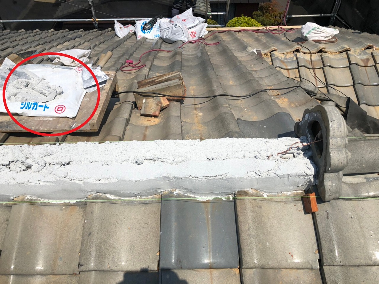 のし瓦を積み上げていきますが、高さ出しの為葺き土を乗せていきます。2段目ののし瓦を積みます。写真で見て頂ける様に先程シルガードで作った土台部分の側面が漆喰の役割をしている事が分かりますね。劣化によりポロポロと剝がれたりしても土がむき出しになる事はないですね。使っている瓦は最初に撤去させて頂いた既存の瓦です。元の材料を使う為コストも最小限に抑える事が出来ます。