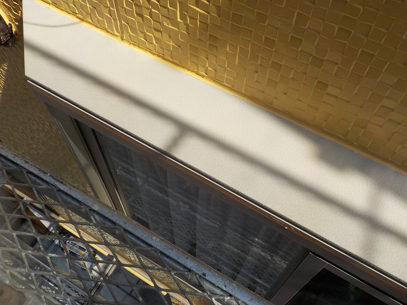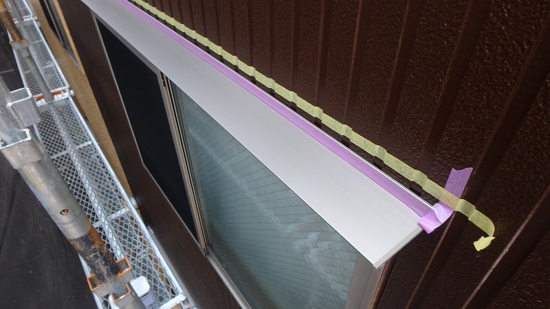 外壁と庇の間に隙間があると雨漏りの原因となります。コーキングで隙間を埋める準備として養生を実施します。