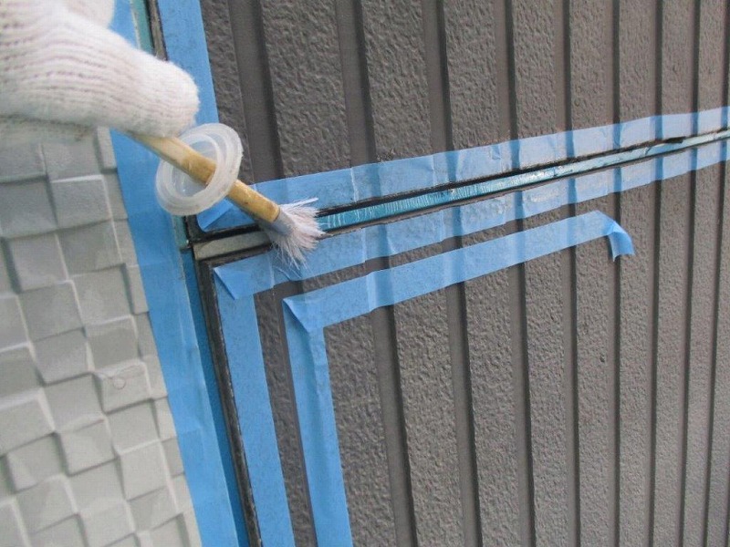 コーキングを補充する下準備として目地の清掃を行い、プライマーを塗布してコーキングと目地の密着力を高めます。