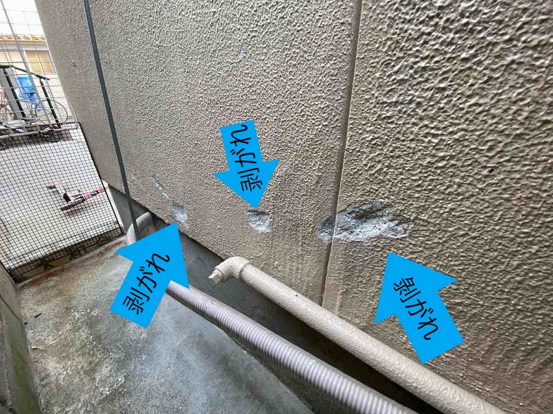 モルタルの剥がれが生じている箇所の裏はお風呂場でした。外壁は外からの影響でも剥がれや浮きはありますが、中からの湿気や熱が原因でこういった事が起きることもあり得るのです。