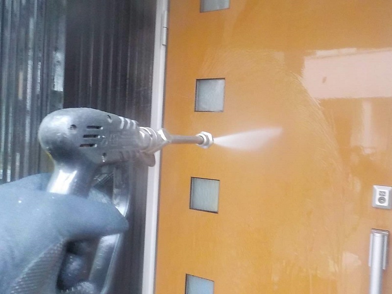 水の侵入経路を塞いだあと、外壁全体を洗浄していきます。その際使用しますのが業務用高圧洗浄機です。(家庭用に比べ威力が強い)