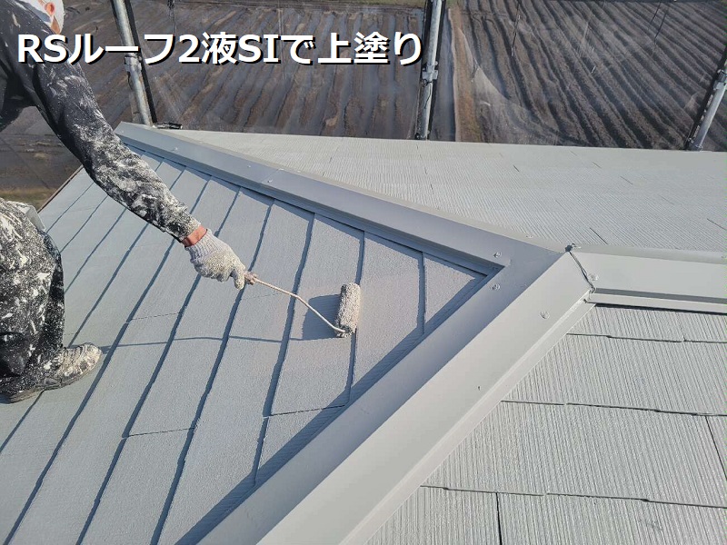 中塗りを乾燥させたあと、またまたRSルーフ2液SIで上塗りをしていきます。上塗りでは仕上げの作業を行い塗膜の厚みを綺麗に形成していきます。