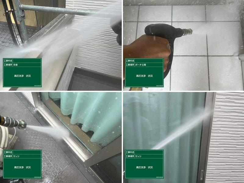 高圧洗浄は高所である屋根から外壁へと降りるように順番に洗浄します。