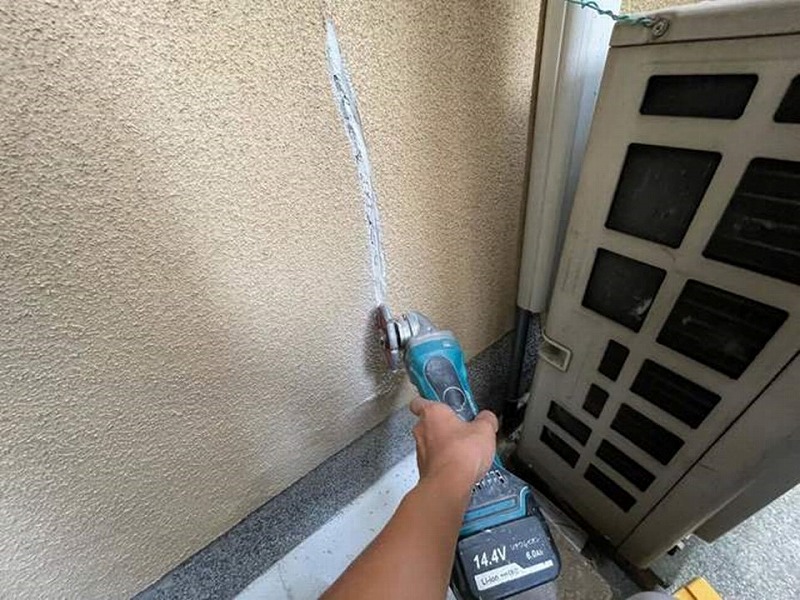 そこでひび割れをあえて深く削り、コーキングを打つ補修領域を増やすVカット補修での工事を提案いたしました。