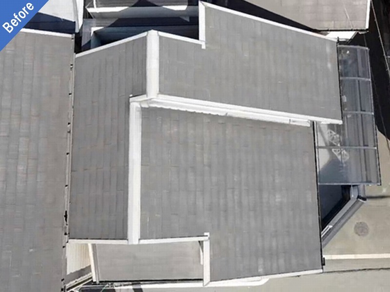 外壁と同時に屋根もドローンで点検したところ、屋根のスレート瓦は雨水が染み込み脆くなっており、色褪せなどの劣化が確認できました。