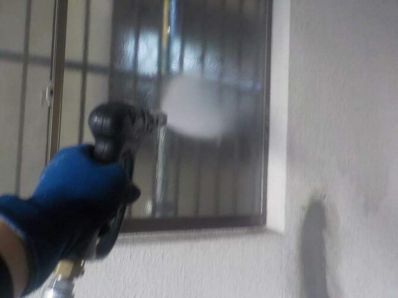 補修跡のフラットになったモルタルに、吹付け塗装で凹凸の模様を付けて補修跡を目立ちにくくさせます。