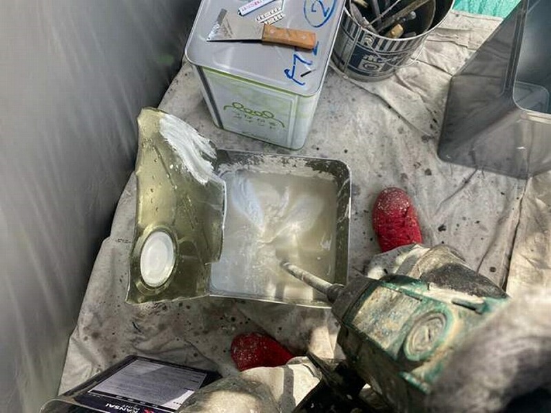 塗料の密着を良くするために事前にケレン作業といってヤスリで細かい傷を付ける作業をします。