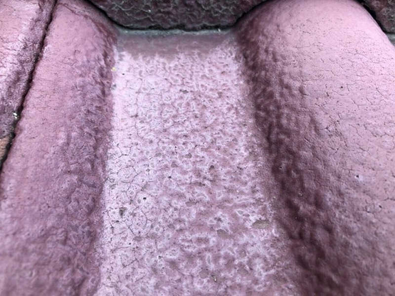 ドローンでモニエル瓦を拝見したところ、表面の塗膜にひび割れが見られチョーキング現象が確認できたため、表面の塗膜が寿命を迎えていると診断いたしました。