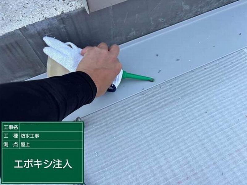 塩ビ鋼板を取り付けた後はビス穴から雨水が侵入しないよう、一つひとつの穴にエポキシ樹脂を注入して防水処理を施します。