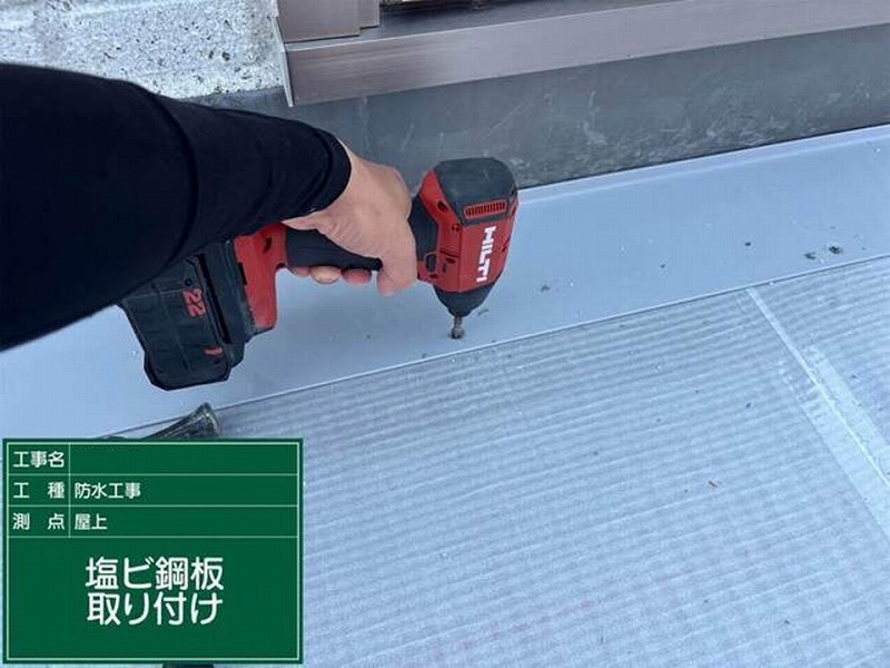 塩ビシート防水はこうした機械固定部材を正確に配置し、規定のピッチで施工することが非常に重要です。