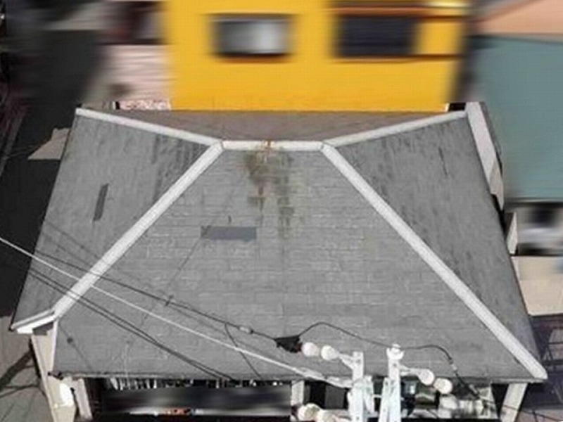 写真をご覧いただくとスレート瓦の一部に雨染みによる変色が見られ、棟板金(むねばんきん)には錆の発生も確認されます。