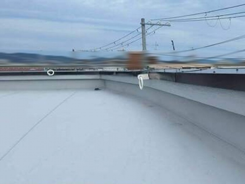 平面と立ち上がりに塩ビシート防水が施工されている陸屋根の現況写真です。
